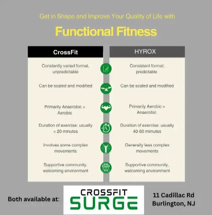 At CrossFit Surge, we are proud to offer two approaches to functional fitness, CrossFit and HYROX. Both approaches are excellent for getting in shape, improving your level of fitness, and helping you live a healthier lifestyle. Although similar in several ways, CrossFit and HYROX have their unique approach to help you achieve your fitness goals.